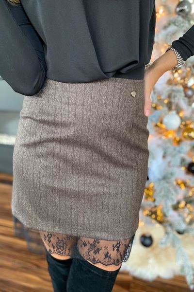 Ontdek de verfijnde elegantie van deze prachtige bruine rok. Gemaakt van hoogwaardig materiaal, straalt deze rok klasse en veelzijdigheid uit. De subtiele details in de stof creëren een tijdloze look die perfect is voor zowel formele als informele gelegenheden. Onderaan de rok vindt u een delicate kantafwerking, die een vleugje vrouwelijkheid en verfijning toevoegt. Combineer deze rok met een elegante blouse en hakken voor een stijlvolle uitstraling, of draag hem met een casual top voor een moeiteloze daglook. Deze rok is een must-have in elke garderobe en biedt talloze mogelijkheden om uw persoonlijke stijl te tonen.