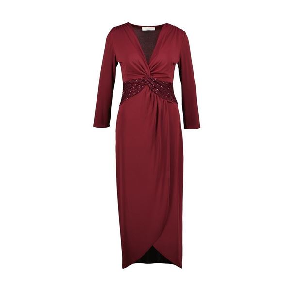 Ontdek deze elegante avondjurk in een rijke bordeauxrode tint. De jurk heeft een verfijnde V-hals en driekwart mouwen die een klassieke uitstraling geven. Het middelpunt van de jurk is de prachtige gedrapeerde taille met fonkelende pailletten die subtiel glinsteren en een vleugje glamour toevoegen. De zachte, vloeiende stof valt prachtig langs het lichaam en eindigt in een charmante split aan de voorzijde, die een speelse doch stijlvolle look biedt. Deze jurk is perfect voor speciale gelegenheden waar je echt wilt stralen.