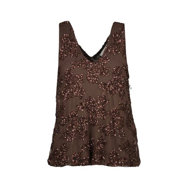 Deze prachtige top straalt elegantie en stijl uit. De diepbruine kleur vormt een glamoureuze basis, terwijl de top versierd is met fonkelende pailletten in een verfijnd bloemmotief. De lage V-hals en de luchtige pasvorm zorgen voor een delicate en vrouwelijke uitstraling. Het vleugje sophisticated glamour maakt deze top een perfecte keuze voor zowel avondkleding als een chique gelegenheid. Combineer het met een strakke broek of een stijlvolle rok om de look compleet te maken.