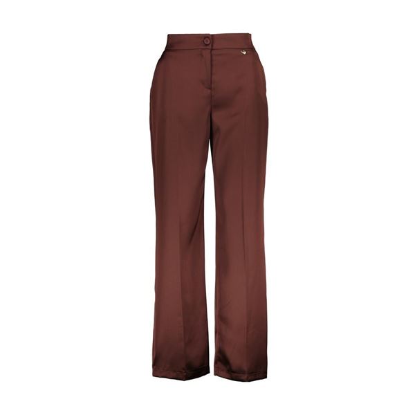 Ervaar de perfecte combinatie van stijl en comfort met deze prachtige donker bordeaux broek van [BRAND], gemaakt van een luxueuze stof die soepel langs je benen valt. De broek heeft een hoge taille en een nette knoop- en ritssluiting aan de voorkant, wat een elegante touch toevoegt. De wijde pijpen geven een klassieke uitstraling die veelzijdig te dragen is, of je nu naar kantoor gaat of een avondje uit. Een subtiel detail is het kleine metalen logo-embleem, dat een vleugje verfijning toevoegt aan deze tijdloze essential.