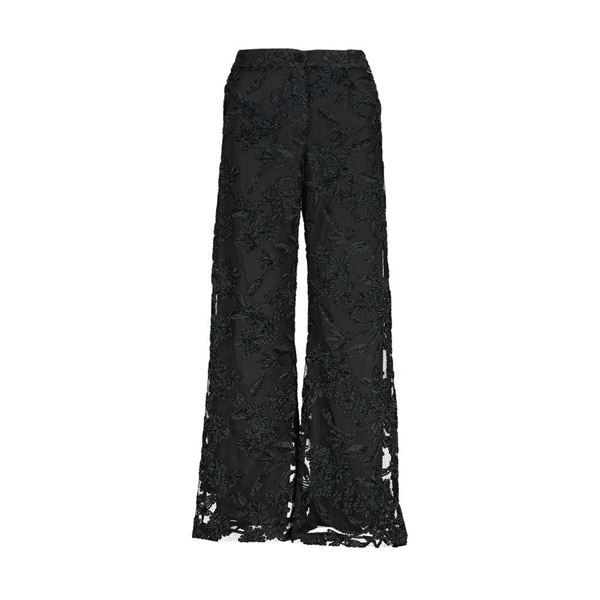 Ontdek de verfijnde stijl van deze prachtige zwarte kanten broek. Deze wijde pijpen zijn voorzien van een elegante, geborduurde bloemenprint die een vleugje verfijning toevoegt aan elke outfit. De stof is licht en luchtig, perfect voor zowel een formele gelegenheid als een stijlvolle avond uit. Met zijn comfortabele pasvorm en stijlvolle uitstraling is deze broek een veelzijdige aanwinst voor je garderobe. Voeg een paar hakken en een mooie blouse toe voor een complete, chique look.