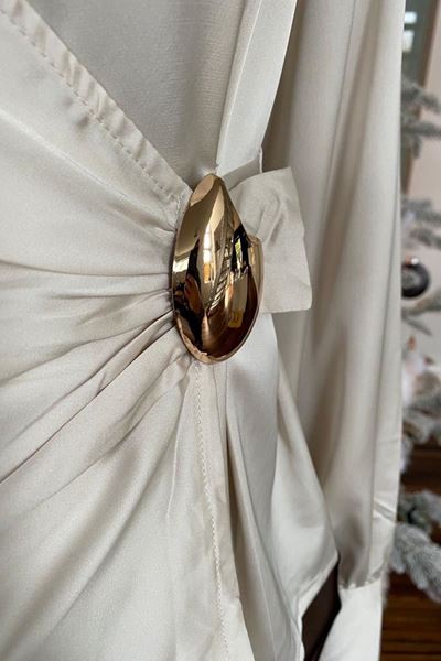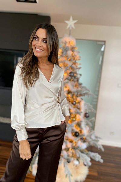 Een prachtige satiné blouse in een elegante ivoorkleur legt de nadruk op een verfijnde uitstraling met zijn luxueuze glans. De blouse is verfijnd afgewerkt met een asymmetrische wikkelvorm en een opvallende gouden gesp aan de zijkant, wat zorgt voor een moderne twist.