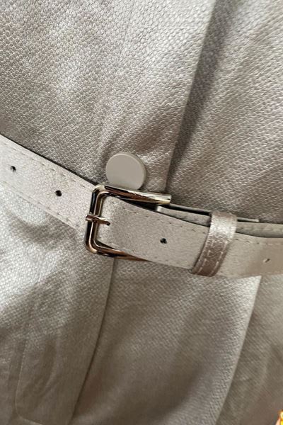 De kleding op de afbeelding straalt elegante verfijning uit. De outfit bestaat uit een stijlvolle jumpsuit in een glanzende zilveren tint, die een vleugje glamour toevoegt aan elke gelegenheid. De jumpsuit heeft een mouwloos ontwerp met een klassiek gerond revers, waardoor een verfijnde en tijdloze uitstraling ontstaat. De bijpassende ceintuur accentueert de taille en zorgt voor een flatterende pasvorm.