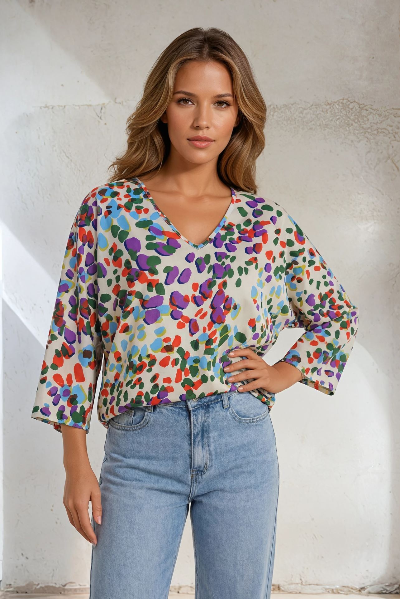 Deze prachtige blouse straalt vrolijkheid uit met zijn levendige kleuren en unieke patronen. Het heeft een basis van crèmekleurige stof met een speels multicolor stippenpatroon in rood, paars, groen en blauw. De blouse heeft een V-hals en wijde, driekwart mouwen die zorgen voor een comfortabele en luchtige pasvorm. Het is ideaal voor een casual uitje met vrienden of een gezellige lunch. Het materiaal lijkt licht en ademend, wat het perfect maakt voor warmer weer.
