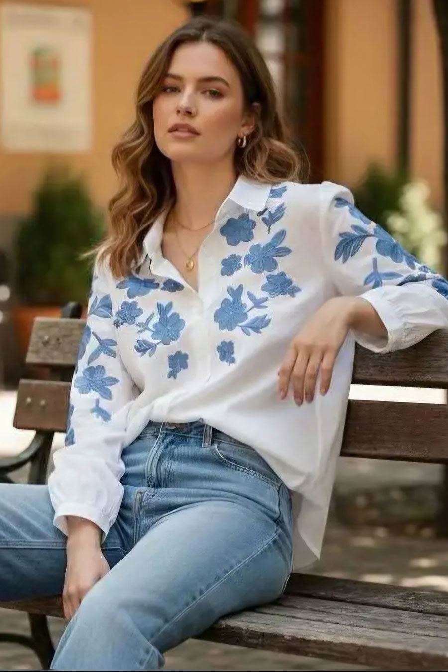 Ontdek deze prachtige look met een witte blouse die is verfraaid met blauwe bloemenborduursels. De blouse heeft een charmante, casual uitstraling met lange mouwen die perfect zijn voor diverse gelegenheden. Combineer het met deze lichtblauwe jeans , die zorgt voor een tijdloze en comfortabele outfit. De hoge taille van de jeans accentueert de lichaamslijn prachtig. Deze combinatie is ideaal voor een zonnige dag in de stad.