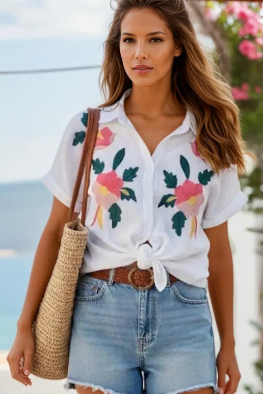 De outfit straalt zomerse vibes uit met een charmante witte blouse, versierd met levendige bloemenpatronen. De blouse heeft een knoopdetail aan de voorkant, wat een speelse uitstraling geeft. De lichte, luchtige stof maakt het perfect voor warme dagen.