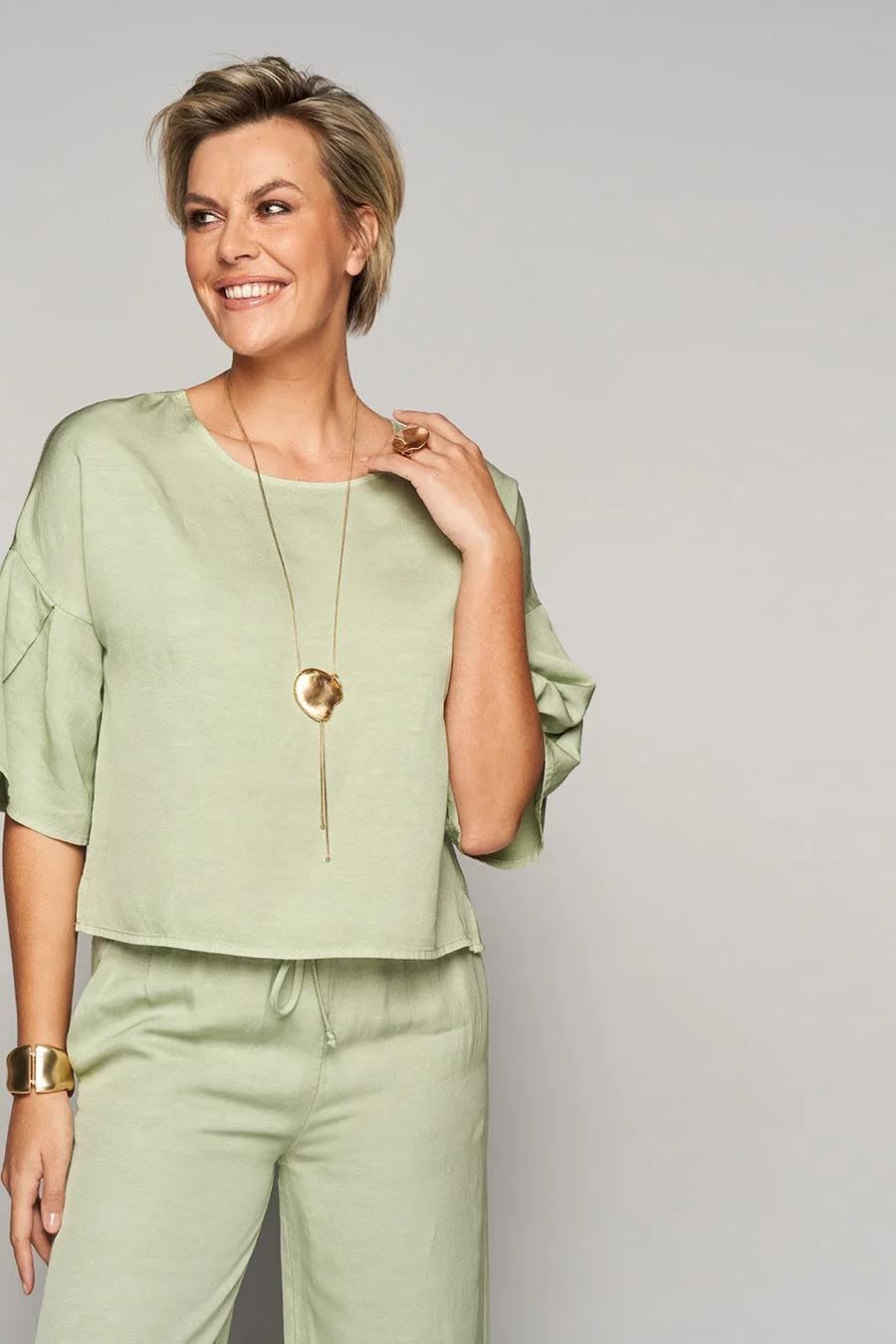 Laat je inspireren door deze stijlvolle set waarmee je gegarandeerd de show steelt. De outfit bestaat uit een frisse, groene blouse met wijde mouwen die zowel elegant als comfortabel oogt. De losse fit maakt het ideaal voor warme dagen. Het subtiele ontwerp van de blouse zorgt voor een tijdloze uitstraling.
