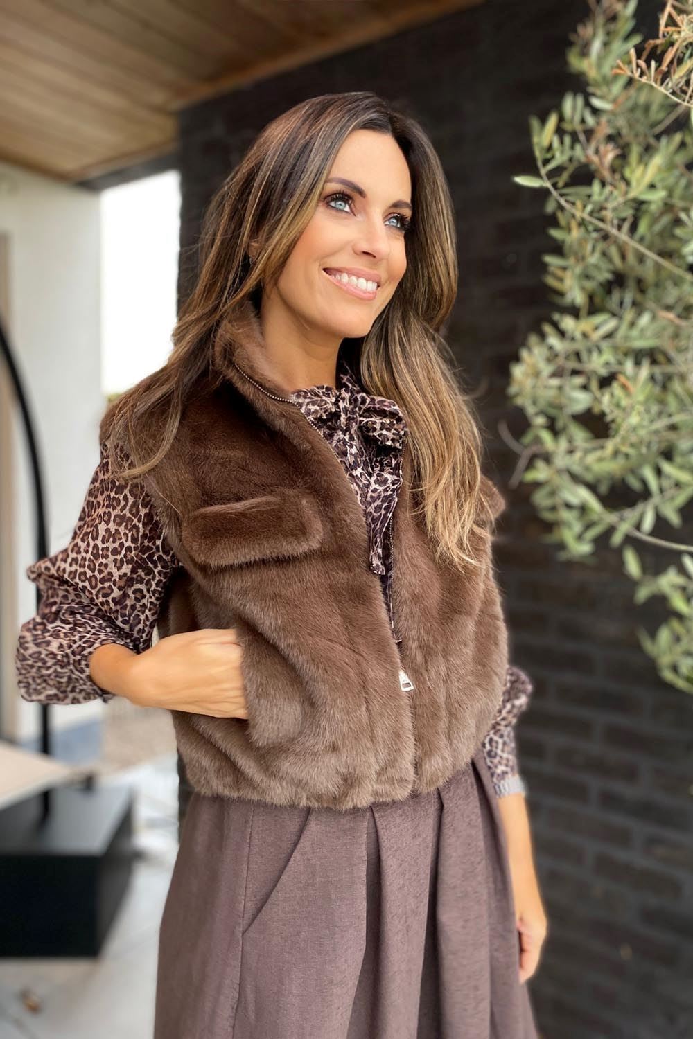 De look bestaat uit een stijlvolle combinatie van warme en klassieke elementen. Het ensemble begint met een prachtige bruine bontgilet, die een gevoel van luxe toevoegt. De gilet heeft een zachte textuur en subtiele details die de aandacht trekken. Onder de gilet draagt ze een blouse met een luipaardprint, die een speelse en toch elegante uitstraling biedt. De blouse heeft een strikje bij de hals, wat een vrouwelijke touch toevoegt en perfect matcht met de bontgilet.