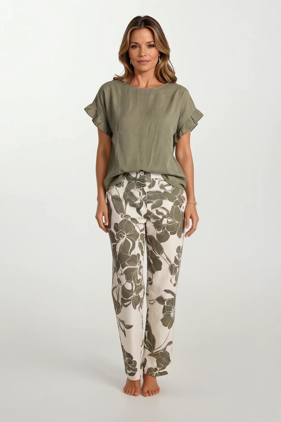 De broek is een waar statement piece met een opvallende bloemenprint. De zachte stof zorgt voor comfort, terwijl de botanische patronen de natuurlijke charme versterken. De neutrale kleuren van de print maken het eenvoudig om te combineren met verschillende topjes en accessoires voor elke gelegenheid.