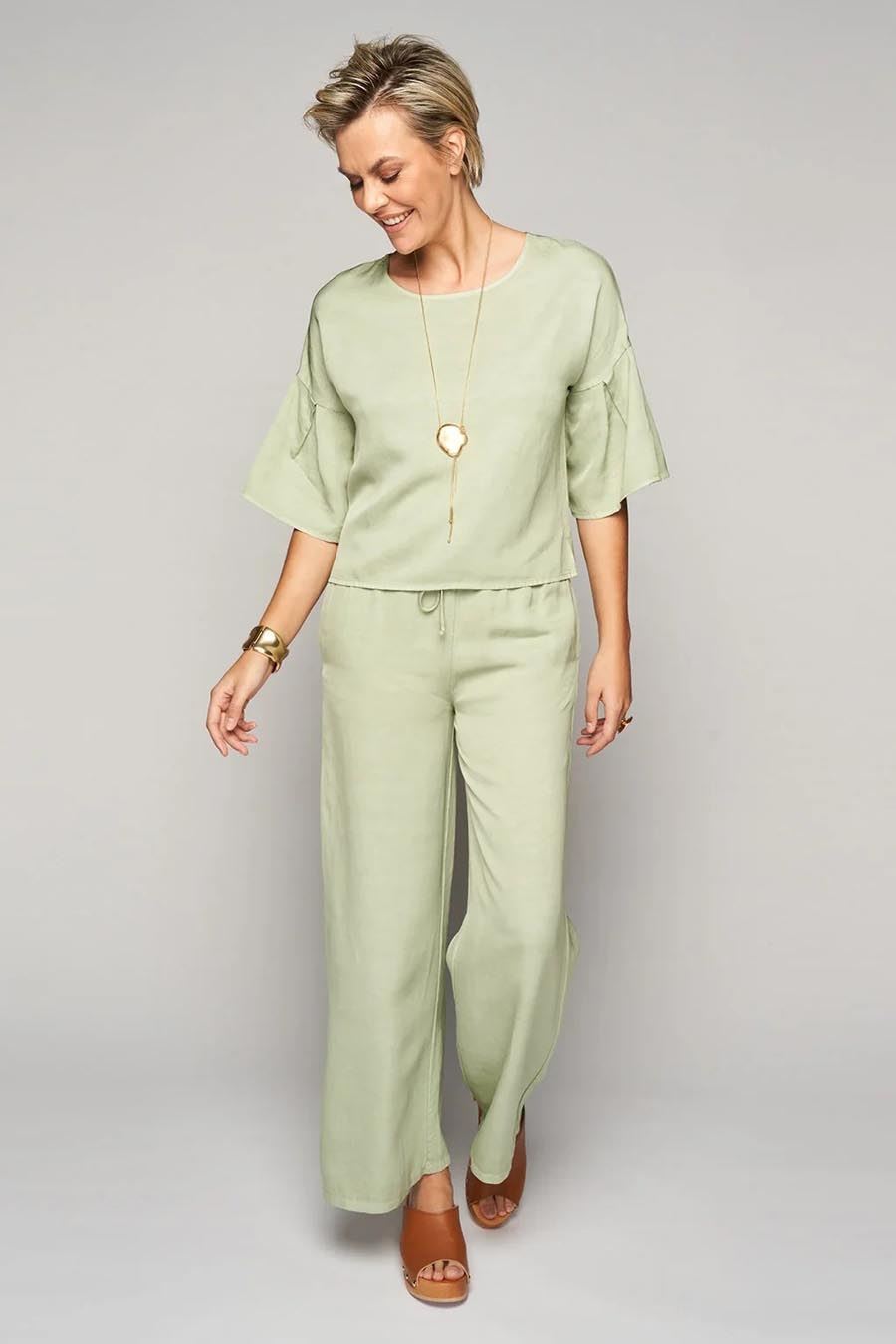 De outfit straalt een frisse en ontspannen zomerse sfeer uit. De set bestaat uit een lichtgroene top (Utano) met wijde mouwen die een vloeiende bewegingsvrijheid bieden. De top heeft een eenvoudige maar elegante snit die zowel comfort als stijl benadrukt. De bijpassende lichtgroene broek met wijde pijpen zorgt voor een soepel silhouet dat perfect is voor warme dagen. De combinatie van top en broek creëert een harmonieus gestroomlijnd effect dat zowel casual als chic is.