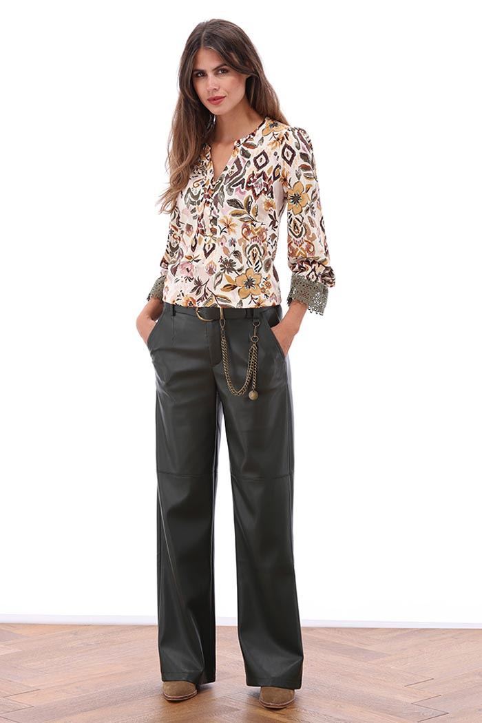 Mooie wijde vegan leren broek in donker groen van het merk k-design met stoere riem en stijlvolle kettingdetails. Perfect voor een edgy look.