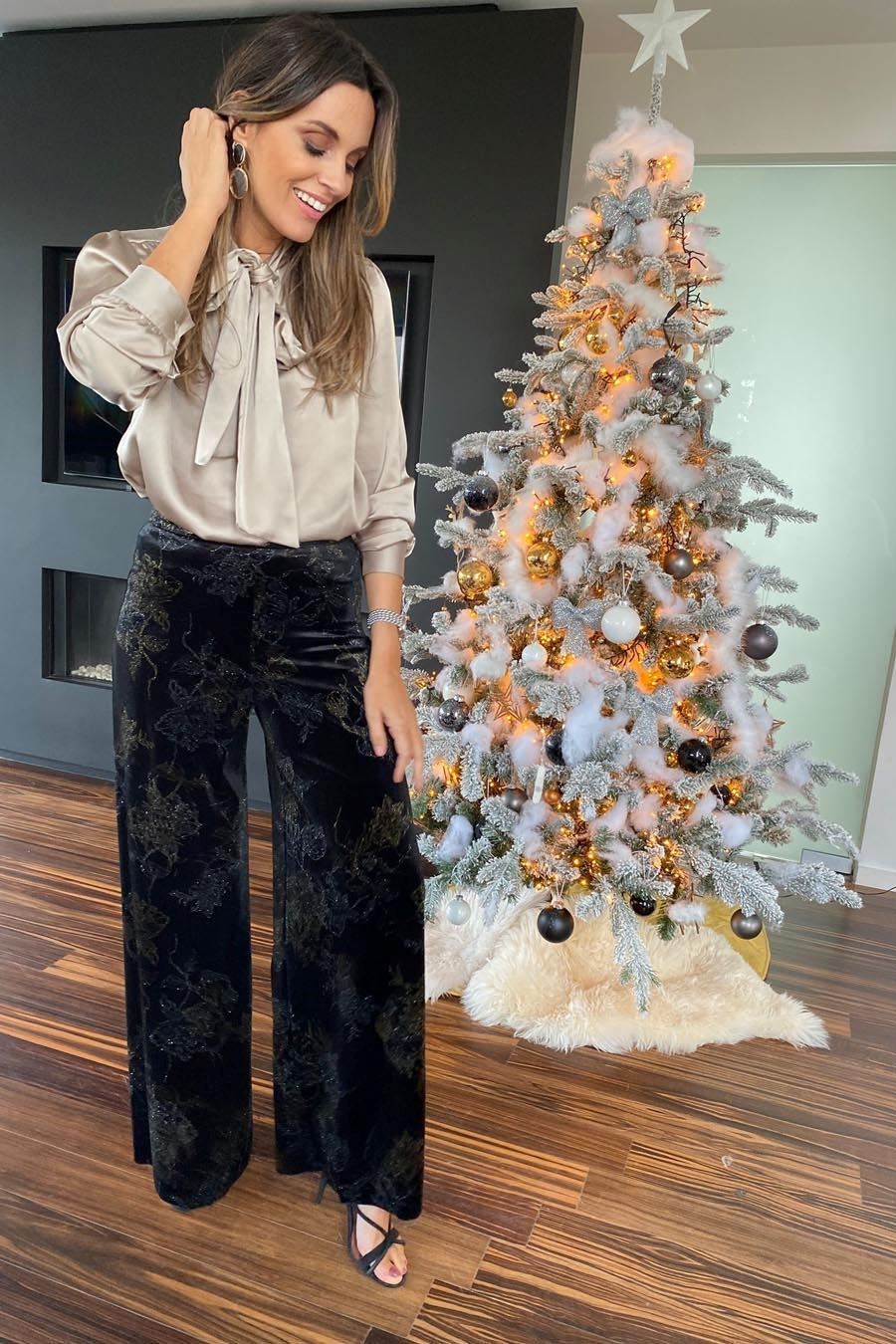 Zwart fluwelen wijdvallende broek van Rinascimento, met subtiele gouden en zilveren bloemen motief.