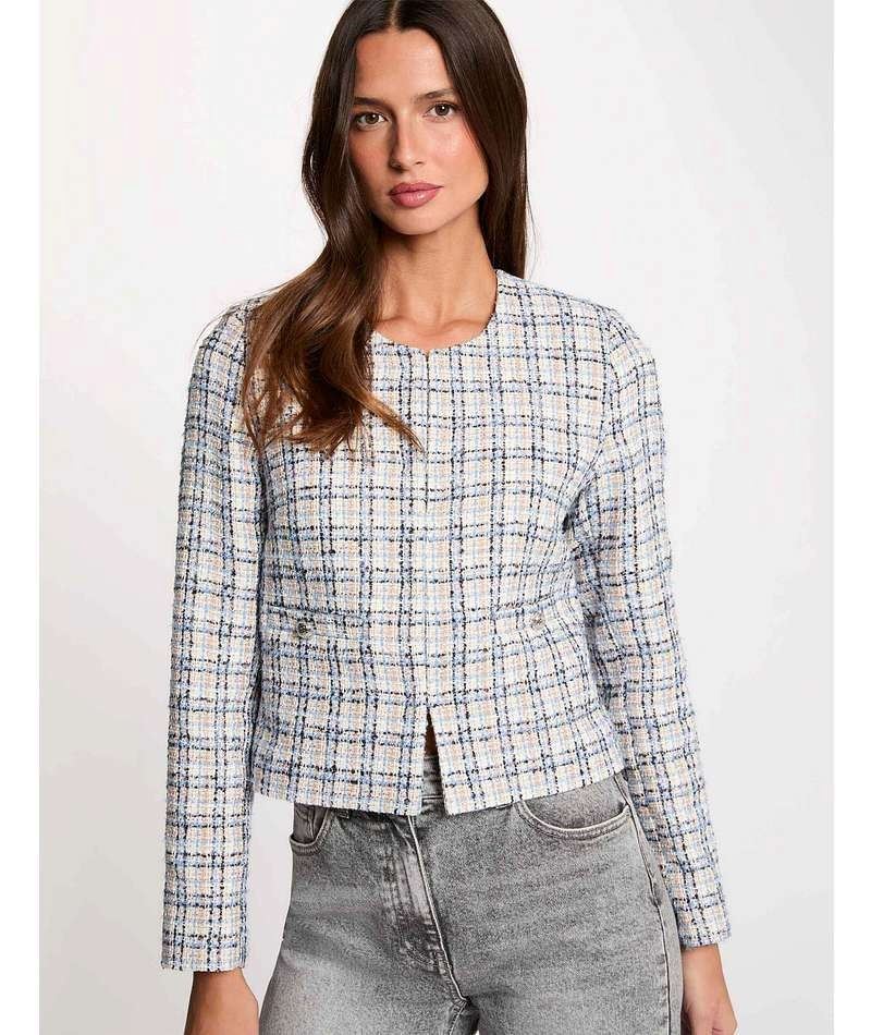 Ervaar de tijdloze elegantie van deze prachtige tweed jack. De stof is een fijn geweven mix van diverse kleuren die een verfijnd ruitpatroon creëert, perfect voor een stijlvolle look. De ronde halslijn en de licht gestructureerde schouders geven een subtiel eigentijdse twist aan deze klassieke stijl. Dit jack past zowel moeiteloos bij casual als formele outfits. De knieloze voorkant zorgt voor een moderne uitstraling en maakt het eenvoudig te combineren met talloze opties in uw garderobe.