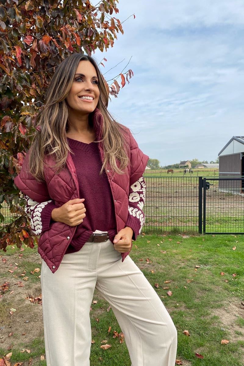 De outfit straalt een prachtige herfststijl uit met een rijke kleurenpalet. De model draagt een dikke, gewatteerde jas in een warme bordeauxrode tint. De jas heeft subtiele knopen aan de voorkant en zorgt voor een knusse uitstraling. Daaronder is een trui met lange mouwen zichtbaar, eveneens in bordeauxrood, die extra flair krijgt door de gedetailleerde witte bloemen- en bladvormen op de mouwen.