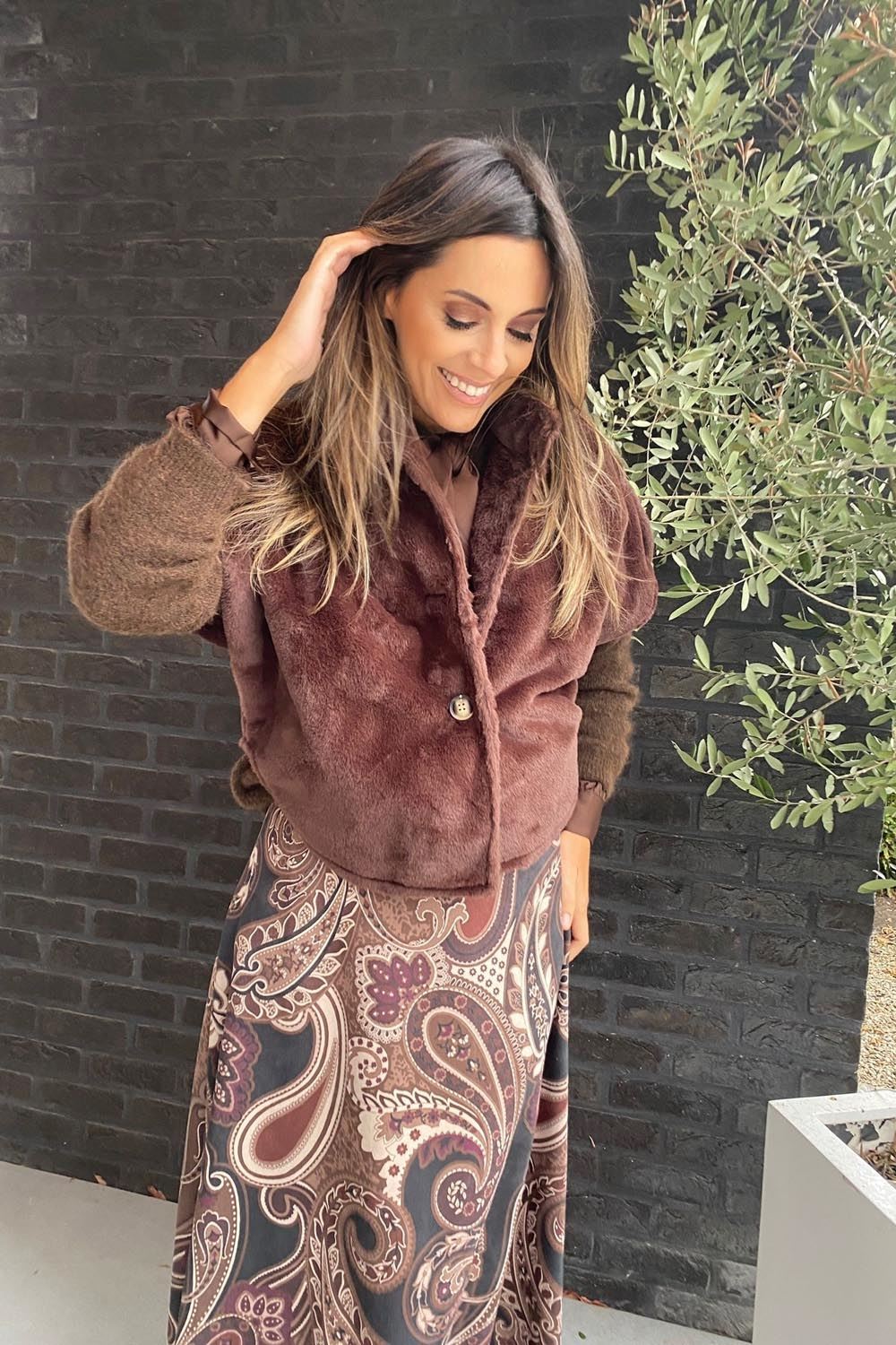 Deze stijlvolle outfit straalt een warme en cosy herfstvibe uit. De jas heeft een rijkelijke bruine tint en is gemaakt van een zachte, pluche stof die verleidelijk omhult. Het ontwerp is kort en sluit met een opvallende knoop, waardoor het een chique en comfortabele uitstraling krijgt. Onder de jas draagt de outfit een effen bruine top die mooi aansluit bij de rest van het ensemble.