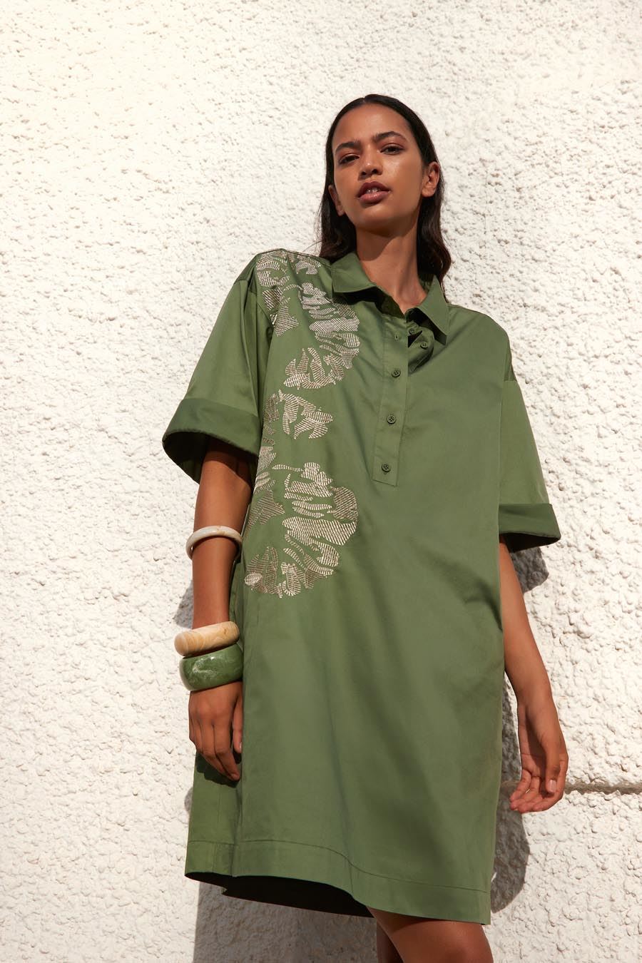 De jurk straalt moeiteloos chique uit met zijn rijke, olijfgroene kleur. De losse, knielange pasvorm biedt zowel comfort als stijl, waardoor hij perfect is voor veelzijdig dragen. Een opvallend bladmotief siert subtiel de voorkant, wat een speelse maar verfijnde touch toevoegt aan het geheel. De jurk heeft steekzakken en een klassieke kraag met knoopsluiting, wat het een tijdloze uitstraling geeft.