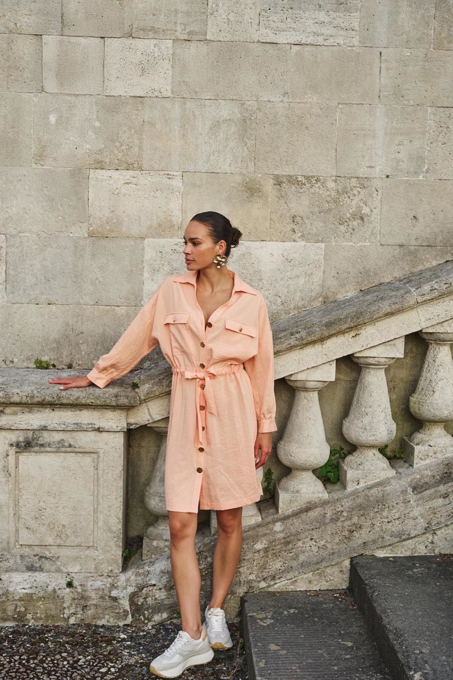Deze jurk is een zomerse knaller! Lichte perzikkleur, goudkleurige knopen en een strikceintuur voor een casual-chique look. Ideaal voor een zomerse dag!