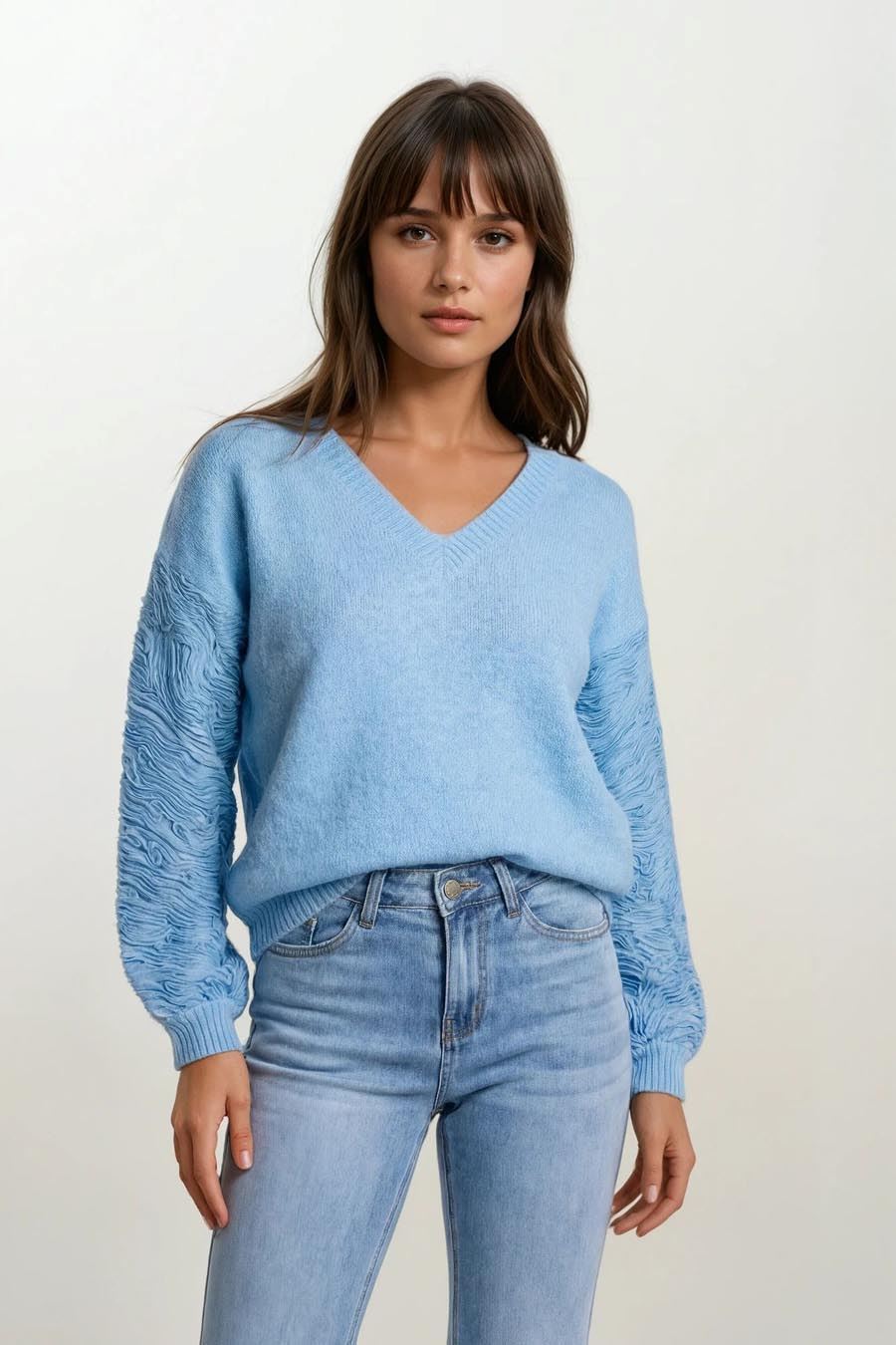 De trui heeft een prachtige licht blauwe kleur met een zachte textuur, de rushe mouwen voegen een uniek en speels detail toe. De v-hals zorgt voor een flatterende uitstraling.