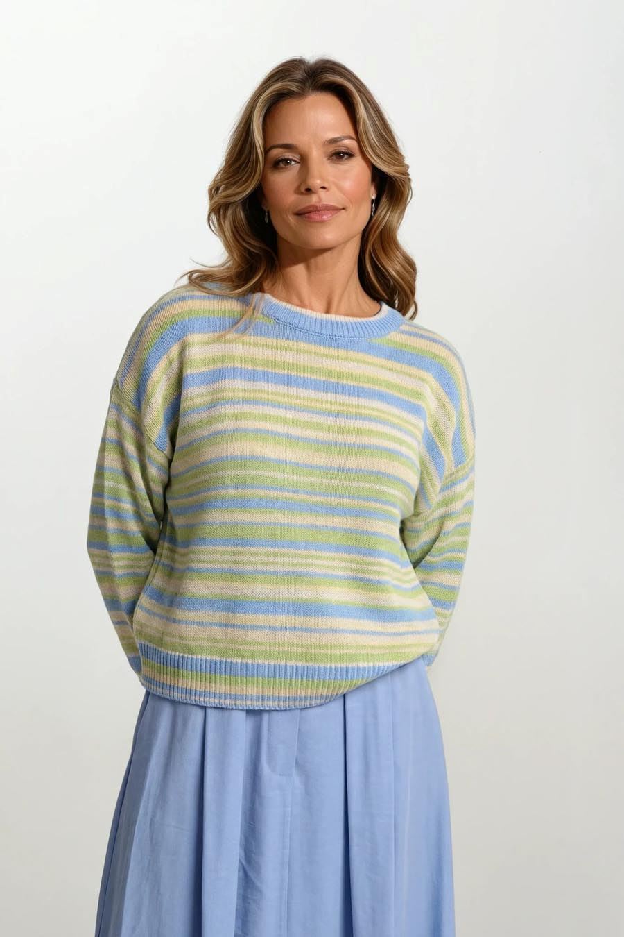 De outfit straalt een frisse en levendige uitstraling uit met een kleurrijke, gestreepte trui. Deze trui heeft subtiele tinten van blauw, groen en pastelkleurige strepen die een speels patroon vormen, perfect voor elk seizoen. De ronde halslijn en de zachte, geribbelde boorden zorgen voor een comfortabele pasvorm. De losse lange mouwen geven een nonchalant en toch stijlvol silhouet.