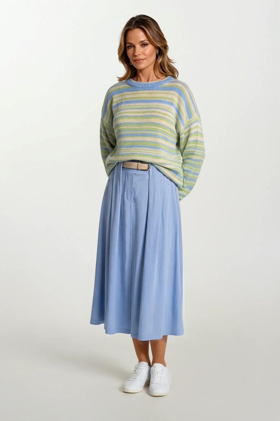 De outfit straalt een moeiteloze elegantie uit met een zachte, kleurrijke trui voorzien van subtiele strepen in pastelkleuren. Deze oversized trui biedt comfort en stijl, perfect voor een casual dag. De trui is prachtig gecombineerd met een luchtige, lichtblauwe midi-rok die vloeiend valt en een speelse beweging geeft aan elke stap. De rok wordt stijlvol geaccentueerd met een subtiele riem, die een vleugje verfijning toevoegt aan de hele look.