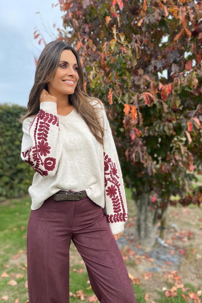 Comfortabele crèmekleurige trui met rode bloemenborduursels op de mouwen. Perfect om lekker warm te blijven. Ze combineert het met een stijlvol, donkerrood broekje dat de outfit helemaal afmaakt. Echt een toffe look!