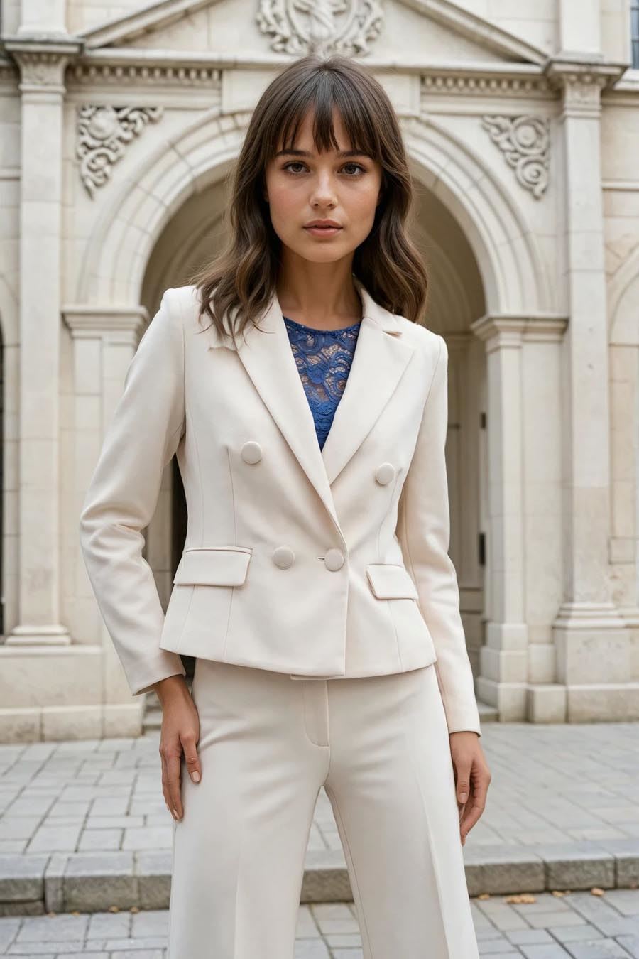 De outfit straalt elegantie en verfijning uit met een prachtig crèmewit colbert dat een dubbele rij knopen heeft. Deze blazer van Rinascimento is perfect voor een zakelijke look of een stijlvolle avond uit. Erbovenuit komt een intrigerend blauw kant wat de outfit een speelse maar toch chique touch geeft.