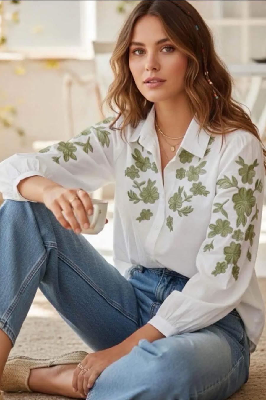 De blouse die hier te zien is straalt een bohemian flair uit met zijn witte stof en weelderige groene bloemenborduursels. Deze levendige details op de mouwen en langs het voorpaneel geven een frisse en natuurlijke uitstraling aan de klassieke witheid van het stuk. De blouse heeft een casual pasvorm met een kraag die zorgt voor een elegante touch.